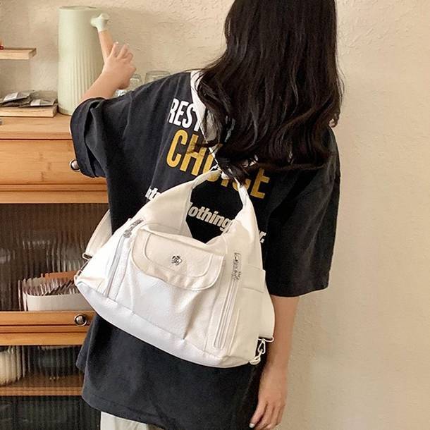 シンプルで上品なデザインながら、機能性に優れたショルダーバッグ。大容量の収納スペースに加え、外側には複数のファスナーポケットを装備し、荷物の整理整頓がしやすい仕様になっています。通勤・通学・ママバッグとしてもぴったりのデザインです。