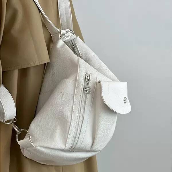 ブラックとホワイトのベーシックな2色展開で、どんなコーデにも合わせやすく、シーズンを問わず使える万能バッグです。ショルダー紐は調節可能で、斜めがけ・肩掛けの2WAYスタイルが楽しめます。軽量かつ柔らかいフェイクレザー素材で、長時間持ち歩いても負担が少ないのも魅力。