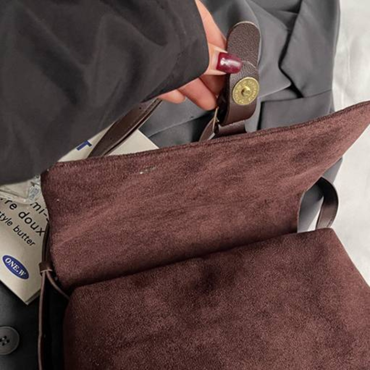 上品なスエード調素材で仕上げたワンショルダーバッグ。やわらかい質感とシンプルなデザインが魅力で、どんなコーディネートにも合わせやすく、デイリーからお出かけまで幅広く使えます。