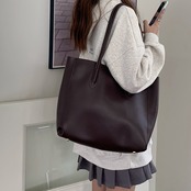 洗練されたシンプルデザインが魅力のフェイクレザートートバッグ。無駄を削ぎ落としたシルエットは、どんなスタイルにも溶け込む万能さが魅力。通勤や通学、ショッピングやママバッグとしても活躍し、大容量ながらも上品な印象を与えてくれる逸品です。