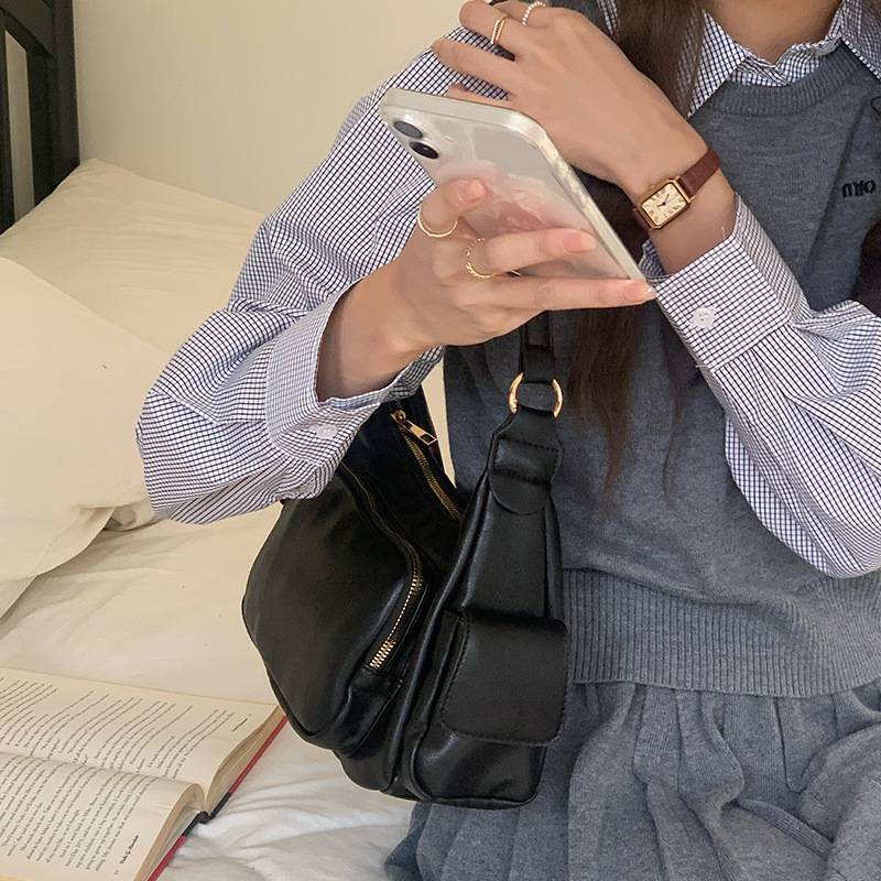 柔らかなフェイクレザーと丸みのあるシルエットが魅力のショルダーバッグ。シンプルながらもフロント・サイドのポケットでしっかり収納力があり、日常使いからお出かけまで幅広く対応。ショルダー・クロスボディどちらのスタイルも楽しめる2WAY仕様です。