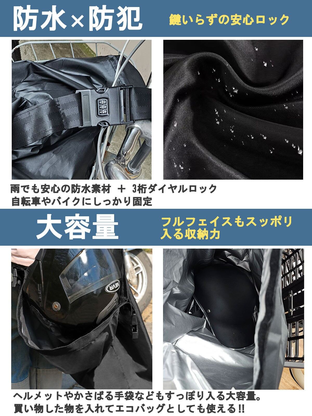 ヘルメットバッグとしてだけではなく買い物した物や貴重品を入れてひったくり防止対策など幅広くお使いいただけます。
