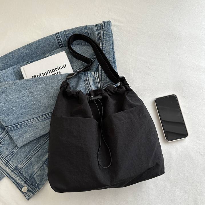 ナチュラルな風合いと程よいカジュアルさが魅力の、巾着タイプのショルダーバッグ。軽量かつ大容量設計で、デイリー使いからちょっとしたお出かけまで幅広く活躍します。シンプルなデザインながら、外ポケットや調整可能なショルダーストラップが機能性も抜群。