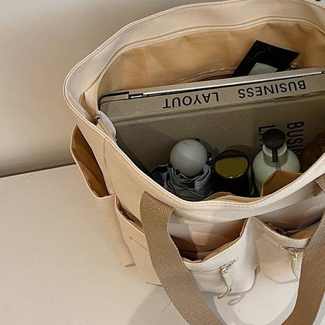シンプルで実用性抜群のキャンバストートバッグが登場。洗練されたデザインに加え、前面にはジッパーポケットが2つ、サイドにはドリンクや小物がすぐに取り出せるポケット付き。A4ファイルやノートパソコン、タンブラー、コスメなどをしっかり収納できる大容量設計で、通学・通勤・マザーズバッグとしても大活躍します。