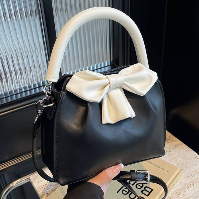 手持ち・肩掛けの2WAY仕様で、付属のストラップでショルダーバッグとしても使える優れもの。普段のお出かけから、デート、女子会、ちょっとしたパーティーまで幅広く活躍します。リボンと持ち手部分がホワイトで統一され、ブラックベースとのコントラストが美しく、視線を引きつけるアクセントに。