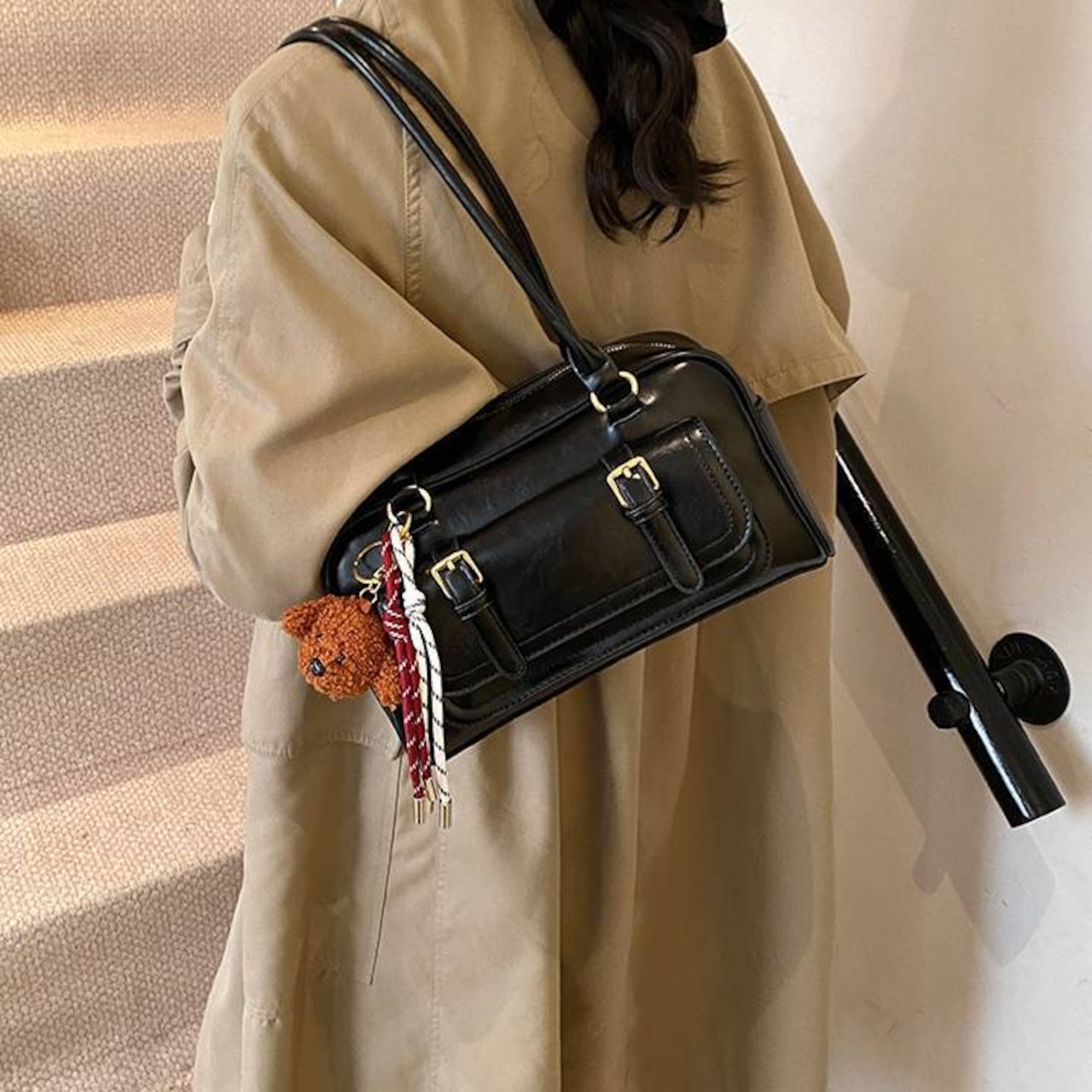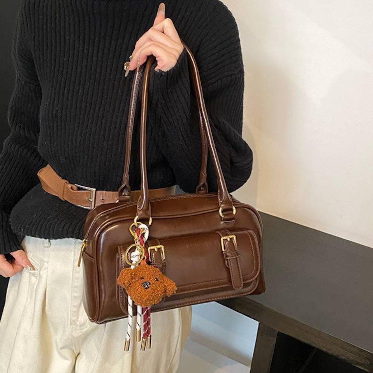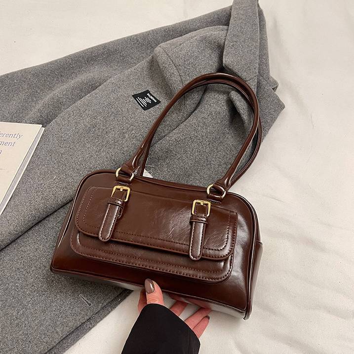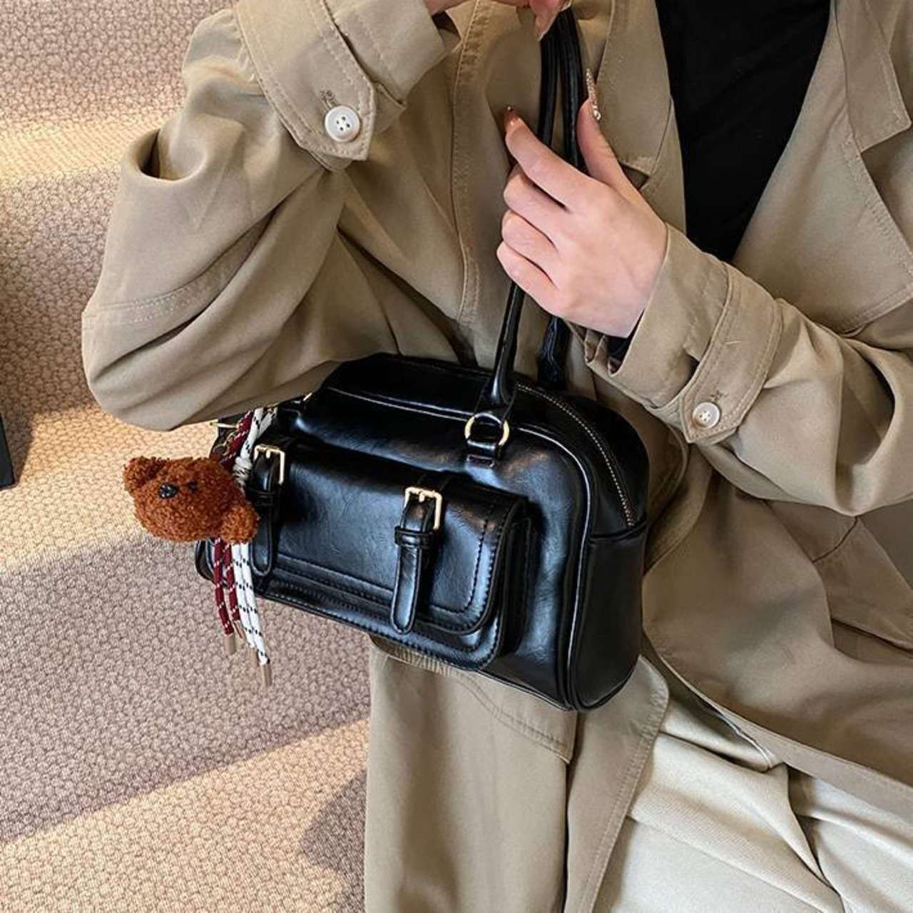 高級感のあるレザー調素材を使用したクラシカルなデザインのハンドバッグ。落ち着いた色合いと上品なシルエットで、大人カジュアルから通勤スタイルまで幅広く活躍。持ち手は肩掛けも可能な長さで、荷物が多い日も安心の収納力を兼ね備えています。
