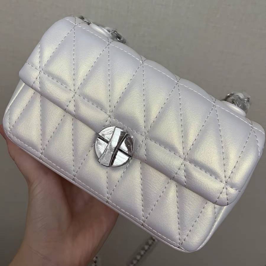 エレガントなキルティングデザインが特徴のチェーンショルダーバッグです。小ぶりながらも必需品をしっかり収納できるサイズ感で、普段使いから特別なお出かけまで幅広く活躍します。チェーンストラップがコーデに華やかさをプラスし、女性らしさを引き立ててくれるアイテムです。