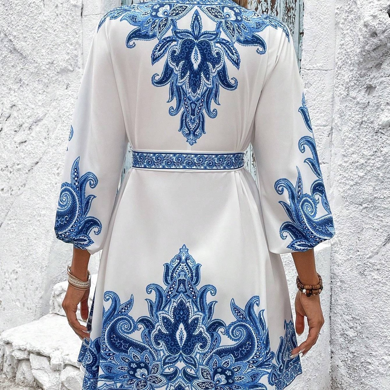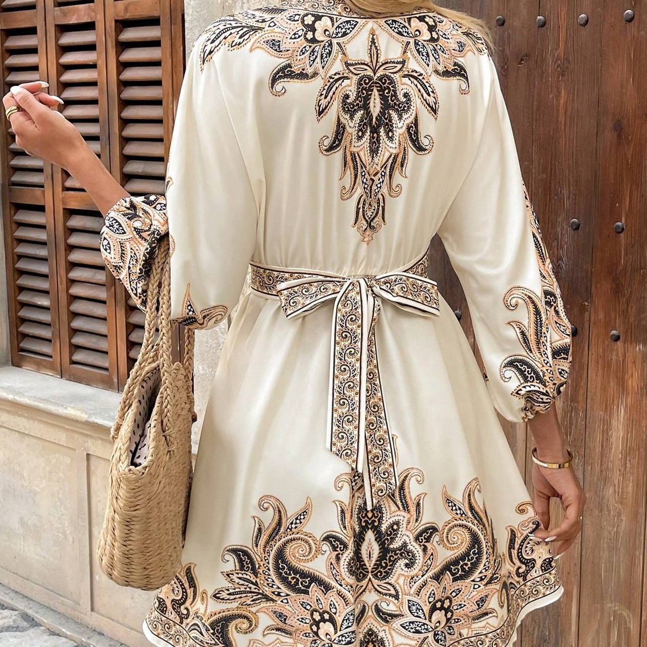 エレガントなエスニック調プリントが魅力のVネックワンピースです。胸元から裾にかけて流れるようなデザインは、女性らしいシルエットを美しく演出。切り替えラインがウエストを引き締め、スタイルアップ効果も期待できます。普段のお出かけから旅行、リゾートまで幅広く活躍するアイテムです。