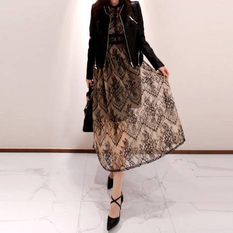 ① ブラックのヒールとミニバッグを合わせて、パーティーや二次会など華やかな場面に。レースが上品に映えます。