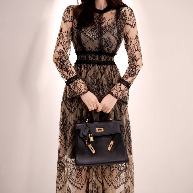 ③ シンプルなパンプスとアクセサリーをプラスして、ディナーやフォーマルなイベントにも。レースの透け感が女性らしさを演出します。