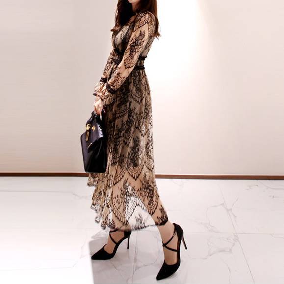 エレガントで女性らしい印象を与えるレース素材のロングワンピースです。繊細な透け感のあるデザインで、特別な日のディナーやお呼ばれシーンにぴったり。ハイウエスト切り替えがスタイルを美しく見せ、歩くたびに揺れるスカートが華やかさを演出します。