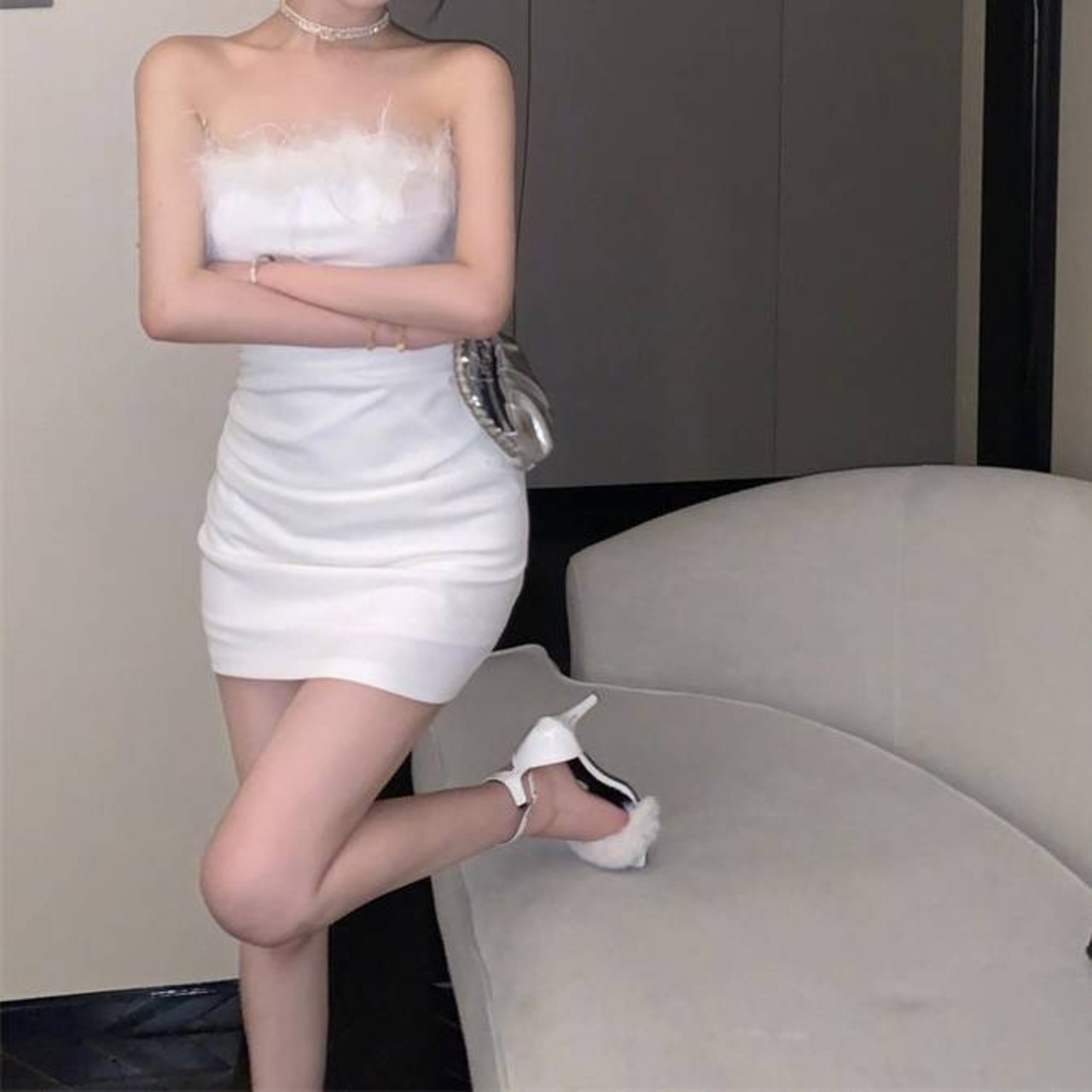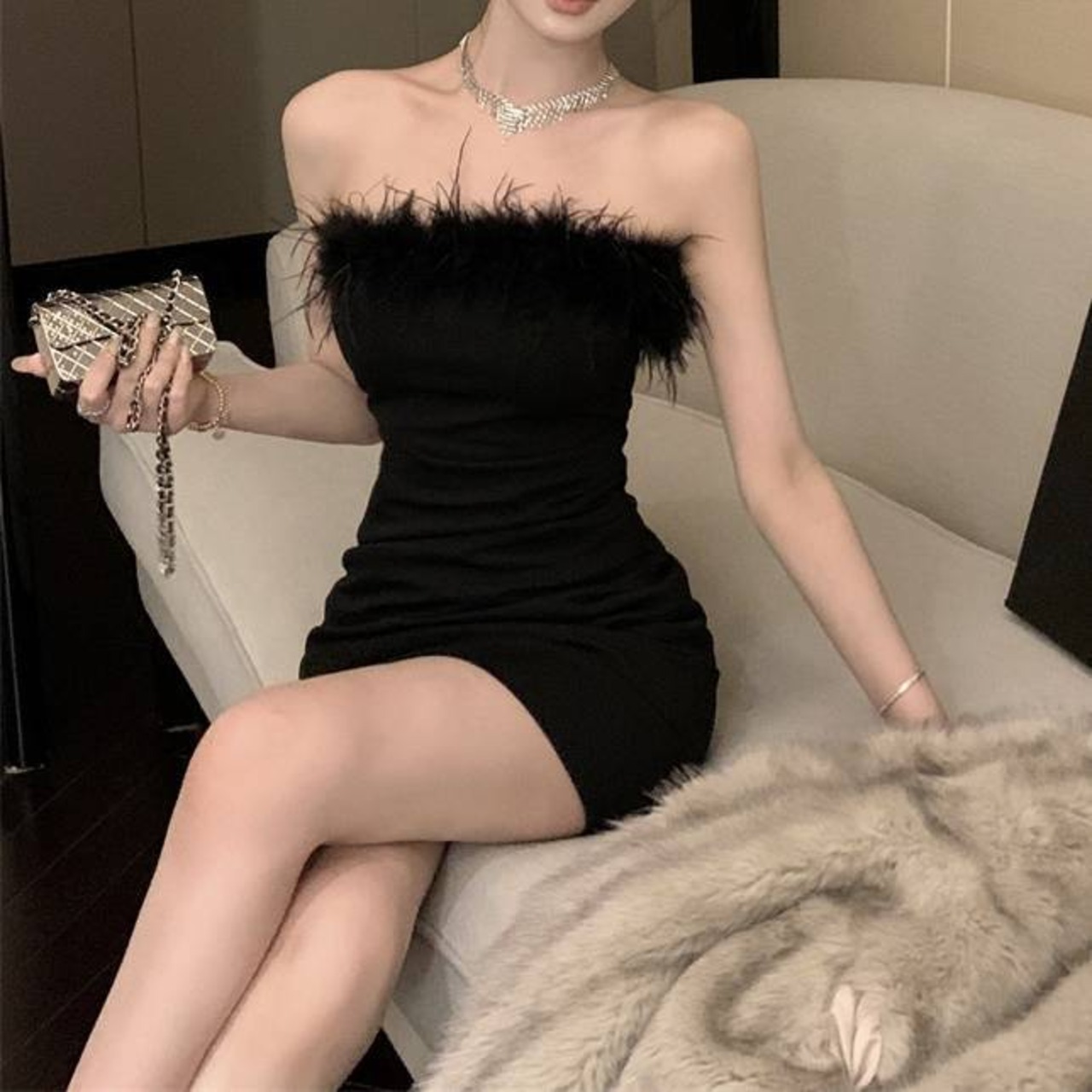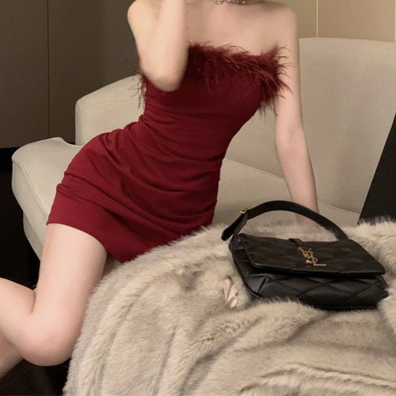 フェザーデザイン ミニワンピース チューブトップ ドレス レディース タイト ショート丈 ブラック レッド ホワイト セクシー 韓国ファッション パーティー ナイトドレス お呼ばれ キャバ ドレス ワンタイプ K-OSS0127