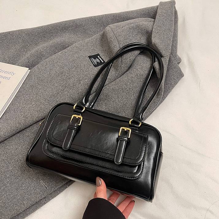 高級感のあるレザー調素材を使用したクラシカルなデザインのハンドバッグ。落ち着いた色合いと上品なシルエットで、大人カジュアルから通勤スタイルまで幅広く活躍。持ち手は肩掛けも可能な長さで、荷物が多い日も安心の収納力を兼ね備えています。