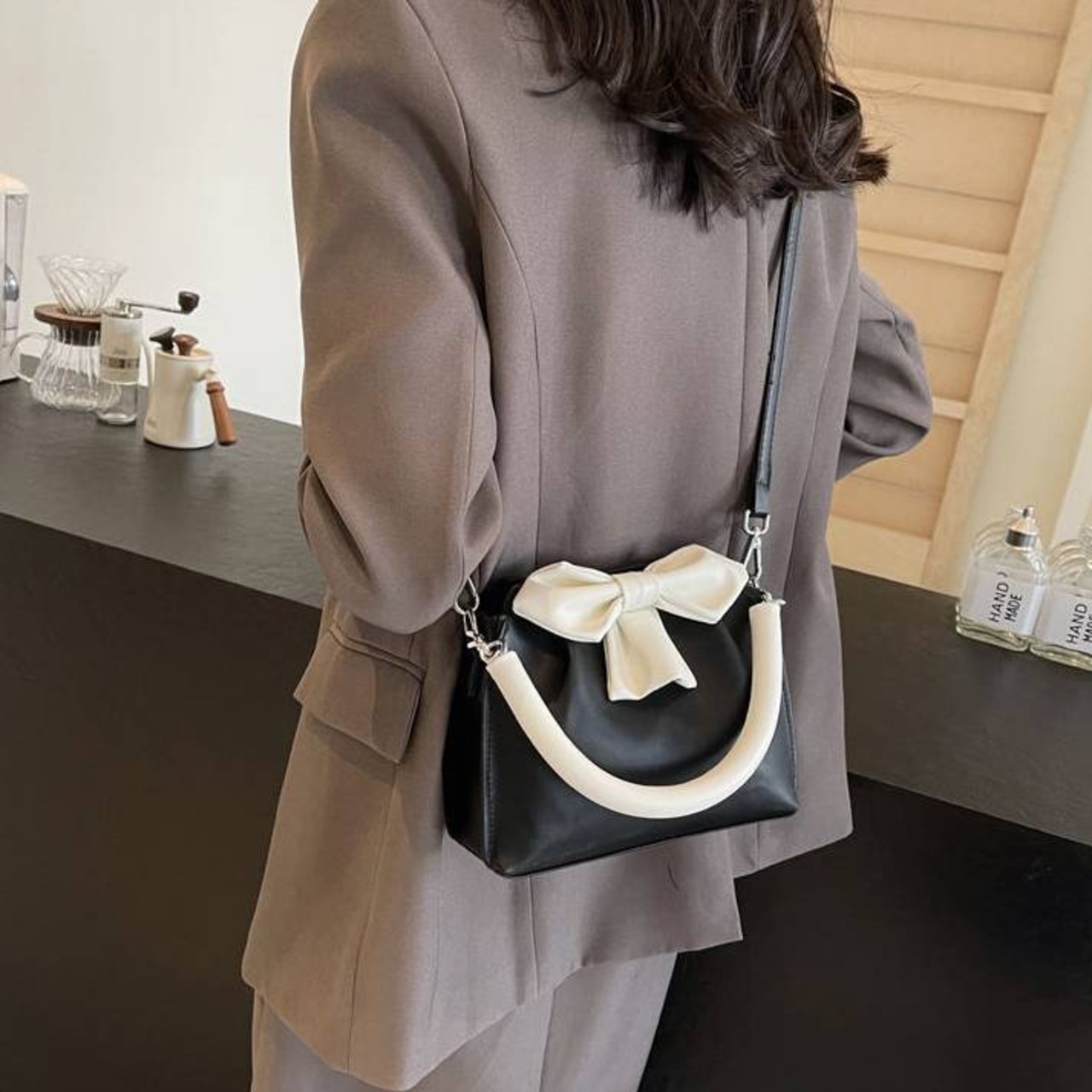 手持ち・肩掛けの2WAY仕様で、付属のストラップでショルダーバッグとしても使える優れもの。普段のお出かけから、デート、女子会、ちょっとしたパーティーまで幅広く活躍します。リボンと持ち手部分がホワイトで統一され、ブラックベースとのコントラストが美しく、視線を引きつけるアクセントに。