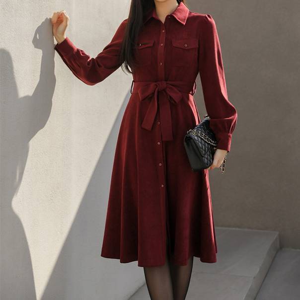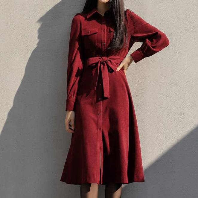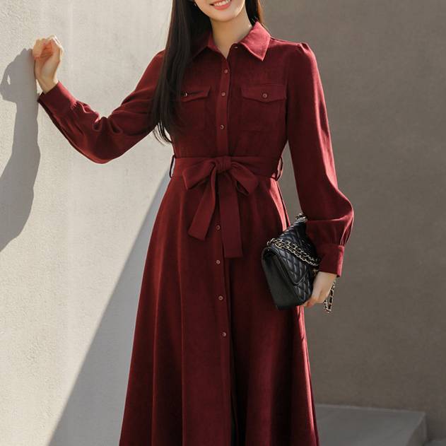 ベルト付き シャツワンピース ミディ丈 長袖 レディース きれいめ 上品 シンプル 無地 フレアワンピース 大人可愛い 韓国風 オフィス 通勤 通学 デート 秋冬 春 着痩せ 美シルエット ベルトリボン ウエストマーク エレガント フォーマル カジュアル ネイビー ボルドー おしゃれ 人気 20代 30代 40代 女性向け ファッション C-OSS0133