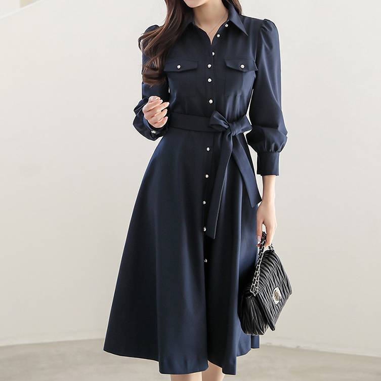 クラシカルで上品な印象を与える、ベルト付きの長袖シャツワンピース。
