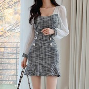 ツイード ワンピース ミニワンピース 長袖 レディース きれいめ 上品 韓国風 スクエアネック フレア裾 パールボタン 透け感 スリーブ デート 通勤 通学 お呼ばれ 結婚式 二次会 春 夏 秋 冬 大人可愛い フェミニン おしゃれ 人気 トレンド 20代 30代 40代 グレー 体型カバー ファッション C-OSS0134