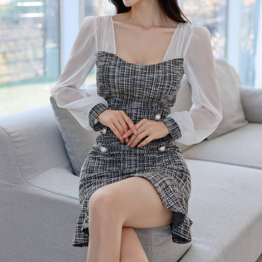 ツイード ワンピース ミニワンピース 長袖 レディース きれいめ 上品 韓国風 スクエアネック フレア裾 パールボタン 透け感 スリーブ デート 通勤 通学 お呼ばれ 結婚式 二次会 春 夏 秋 冬 大人可愛い フェミニン おしゃれ 人気 トレンド 20代 30代 40代 グレー 体型カバー ファッション C-OSS0134