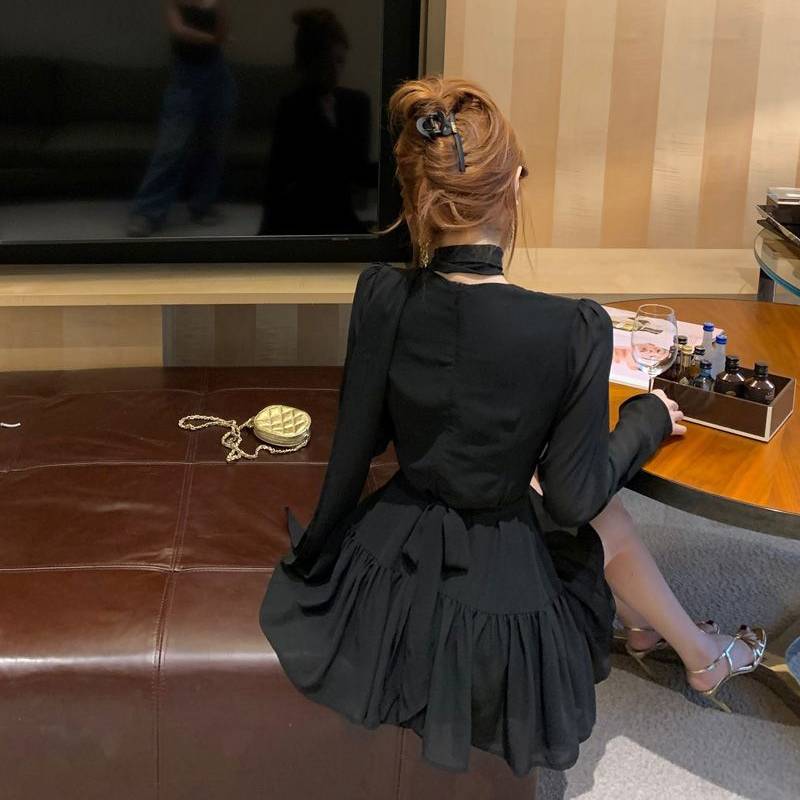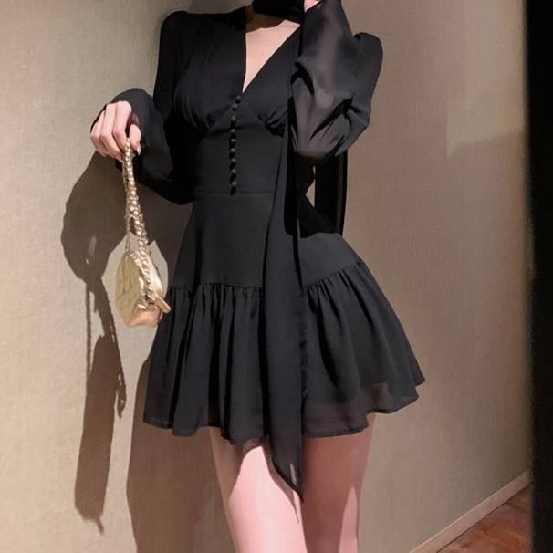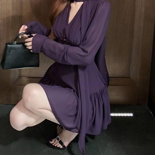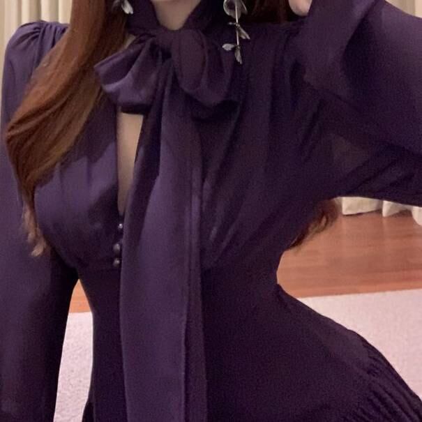 ワンピース レディース 長袖 ミニワンピース フレア Aライン リボンタイ シフォン 上品 きれいめ 韓国風 美脚効果 セクシー 可愛い エレガント 透け感 パーティー お呼ばれ デート ナイトドレス 春 夏 秋 冬 20代 30代 40代 人気 ブラック パープル C-OSS0157