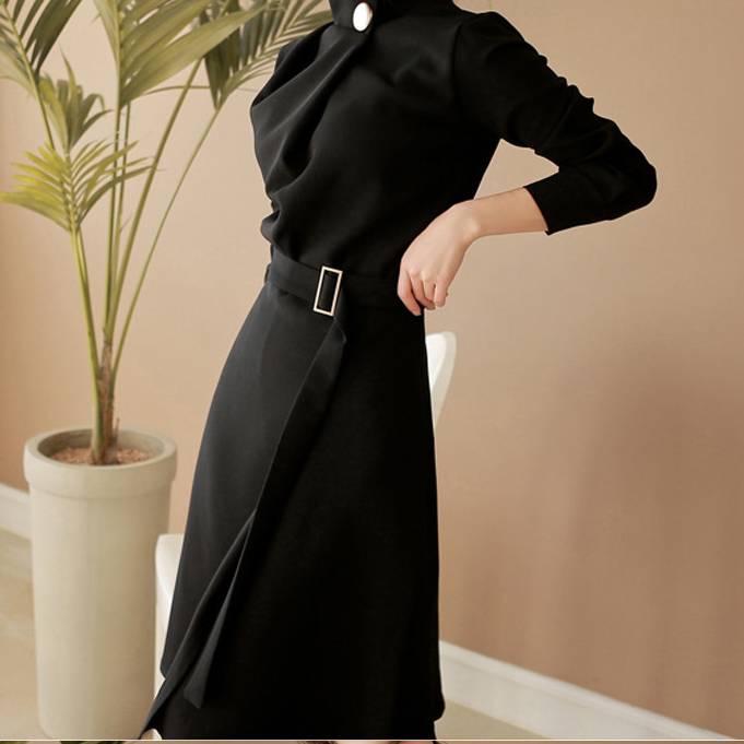 ブラック ボルドー ワンピース レディース ハイネック ベルト付き ドレス ミディ丈 七分袖 エレガント きれいめ 大人 上品 韓国風 フォーマル 通勤 オフィス お呼ばれ 結婚式 二次会 パーティー 秋冬 春 高見え 清楚 美シルエット Aライン 20代 30代 40代 50代 C-OSS0153