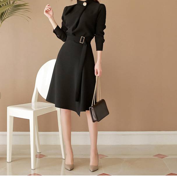 上品な雰囲気を纏う、ベルト付きのハイネックフレアワンピース。