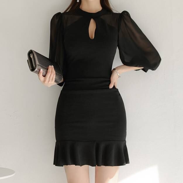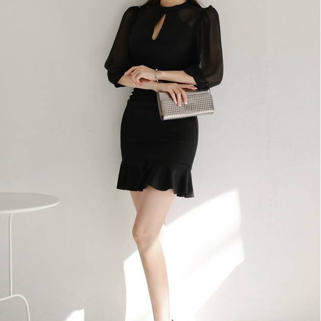ブラック ワンピース レディース シフォン袖 タイトワンピース ミニ丈 フリル裾 ドレス 韓国風 きれいめ エレガント 上品 パーティー 二次会 デート 通勤 OL オフィス 春 夏 秋 冬 美シルエット 着痩せ効果 大人フェミニン 20代 30代 40代 長袖風 透け感 おしゃれ シンプル 高見え 人気 C-OSS0143