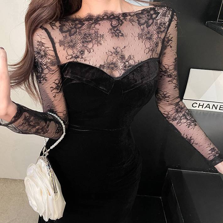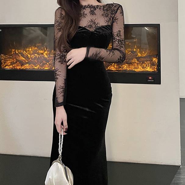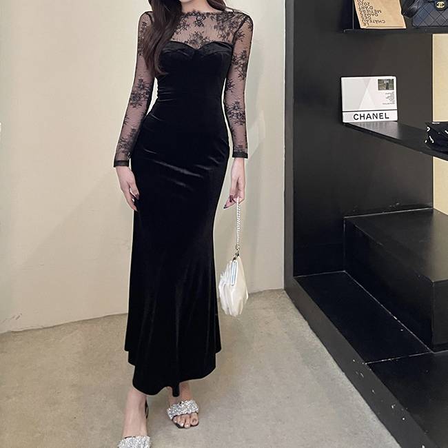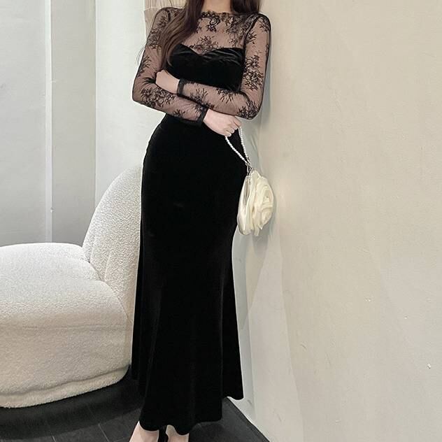 ベロア ロングドレス 黒 レース スリーブ シースルー レディース 上品 高級感 エレガント フォーマル マーメイドライン タイトドレス 韓国風 ワンピース 結婚式 二次会 披露宴 デート 20代 30代 40代 秋 冬 春 パーティー 発表会 お呼ばれ シースルー 長袖 美シルエット 着痩せ 高見え ブラック C-OSS0140