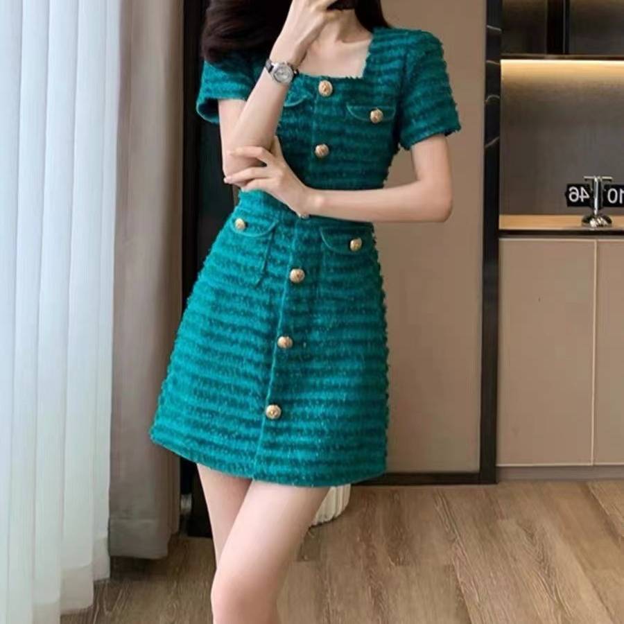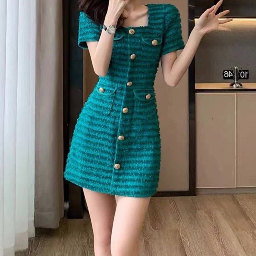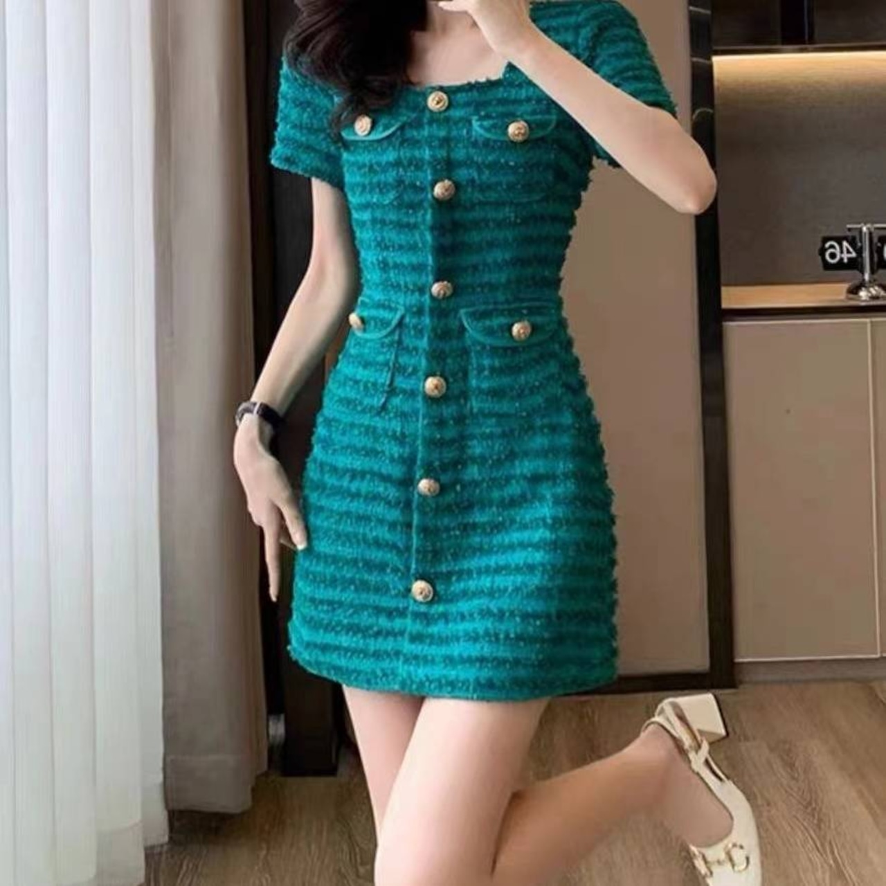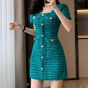 ワンピース レディース ツイード ミニワンピース 半袖 タイト エレガント 上品 高級感 きれいめ 韓国風 かわいい 大人可愛い フォーマル 通勤 デート 二次会 結婚式 お呼ばれ 春 秋 冬 20代 30代 40代 人気 ゴールドボタン フロントデザイン グリーン C-OSS0163