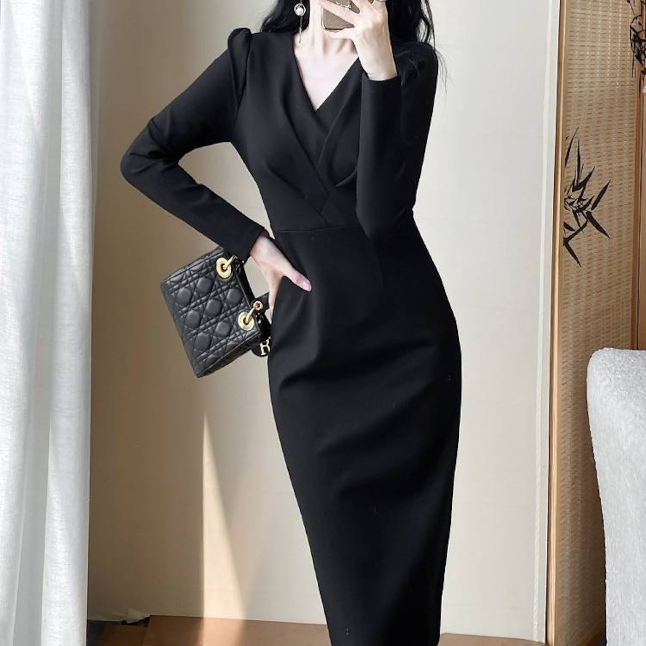洗練された美シルエットが魅力のVネックタイトワンピース。