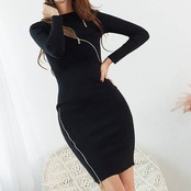 ボディラインを美しく魅せる、ジップデザインの長袖タイトニットワンピース。