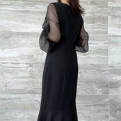 上品な透け感のあるシフォン袖が印象的なマーメイドラインワンピース。