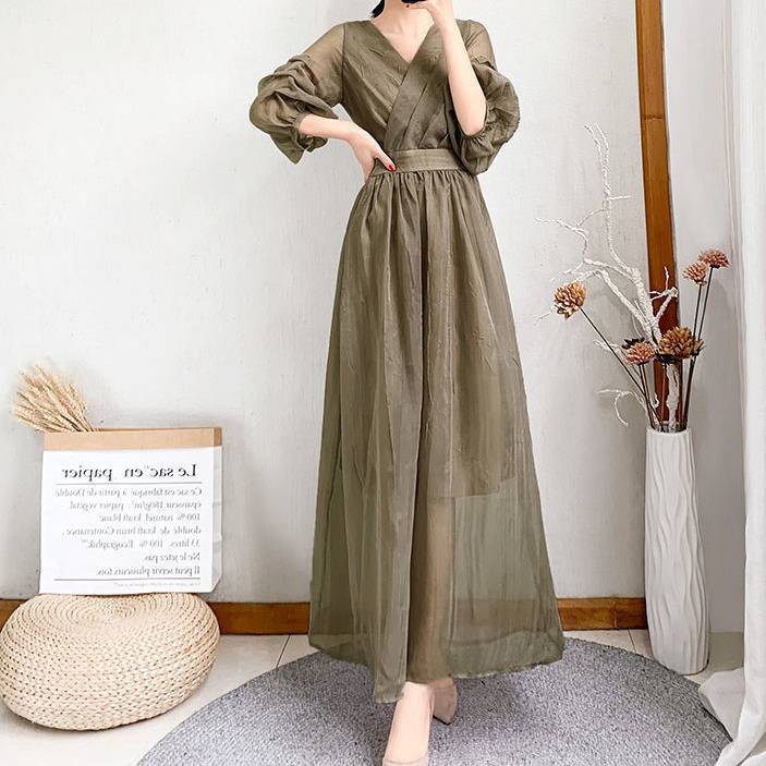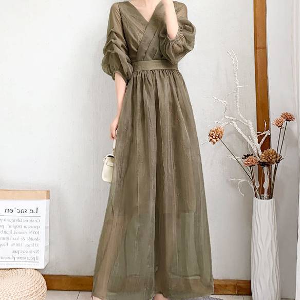 ロングワンピース レディース シースルー Aライン 体型カバー Vネック 長袖 ふんわり袖 マキシ丈 ドレス シアーワンピース エレガント 大人可愛い ブラック パープル グリーン 韓国ファッション 春 夏 秋 冬 きれいめ 通勤 デート 二次会 発表会 同窓会 お呼ばれ 上品 大人コーデ S〜3XL対応 C-OSS0172