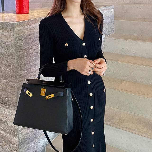 リブニット ワンピース ロング丈 Vネック ゴールドボタン タイトワンピース ブラック レディース 長袖 ドレス 上品 大人可愛い エレガント シンプル きれいめ 通勤 オフィス カジュアル デート 秋冬 春 着やせ効果 美ライン 大人女子 20代 30代 40代 フォーマル モード C-OSS0183
