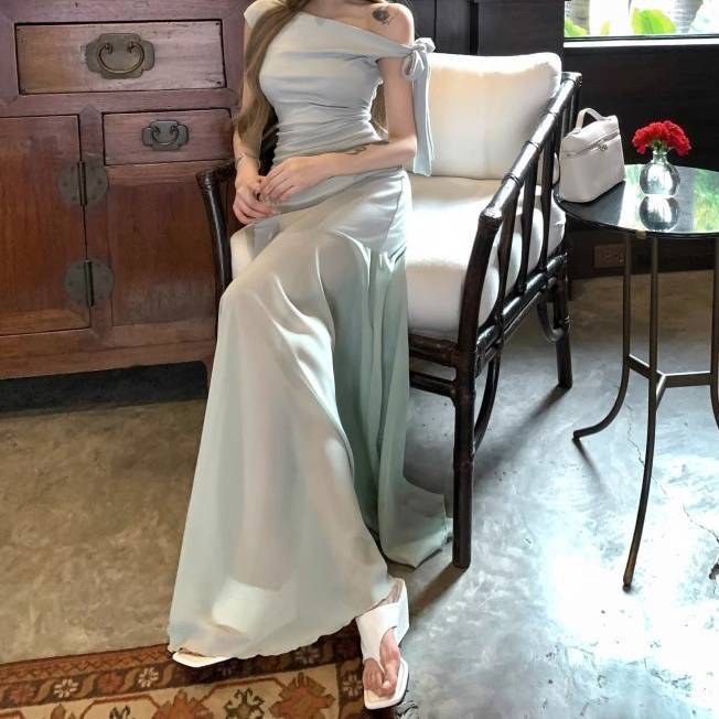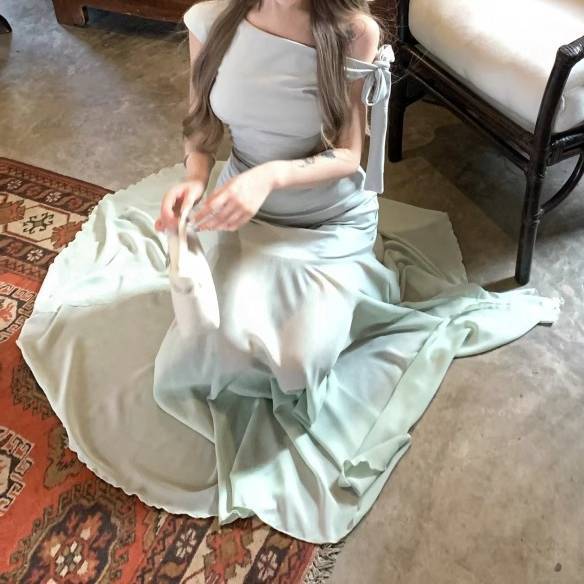 淡いライトグリーンの上品な光沢が魅力のワンショルダーロングドレス。