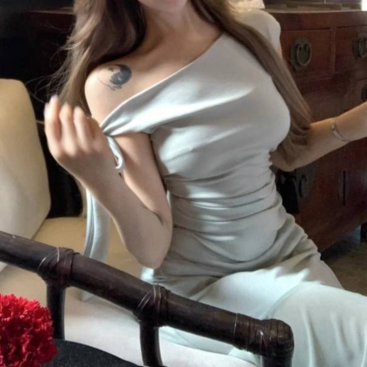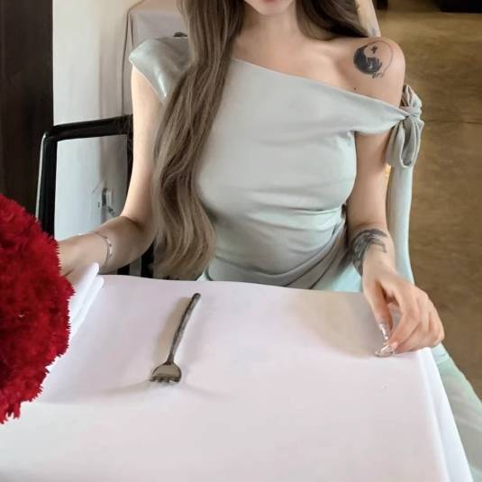 肩に結んだリボンが華やかで女性らしさを引き立て、マーメイドシルエットが美しい曲線を演出します。