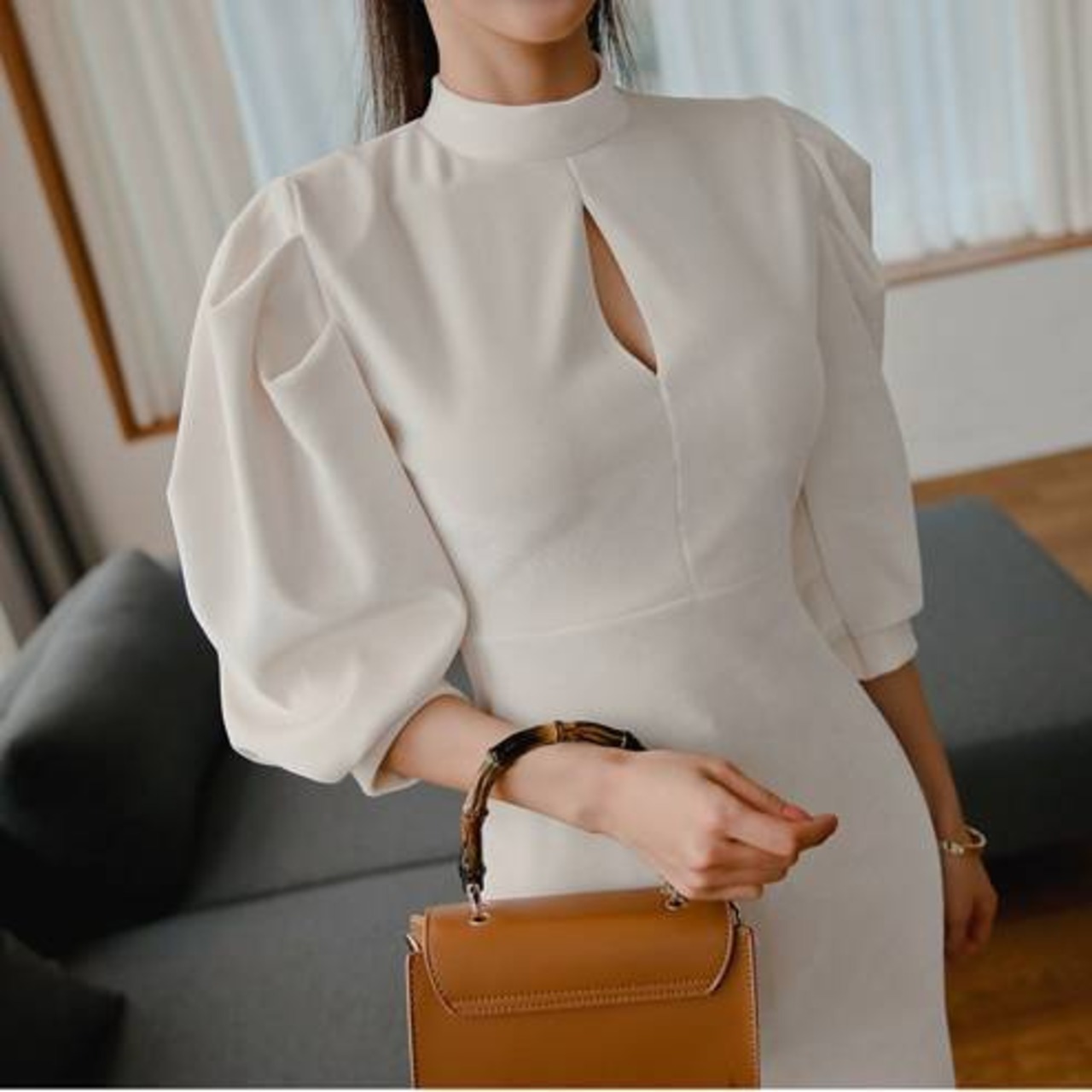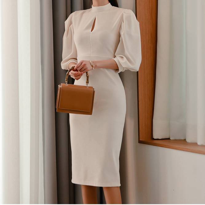 ホワイト ワンピース レディース ミディ丈 タイトワンピース パフスリーブ 長袖 ハイネック 上品 エレガント シンプル きれいめ 韓国ファッション 春 秋 冬 オフィス 通勤 デート お呼ばれ 二次会 パーティードレス 高級感 清楚 美シルエット 着痩せ 人気 トレンド C-OSS0201
