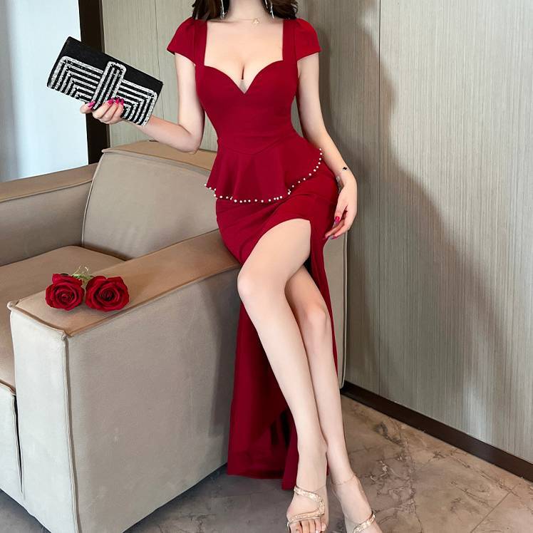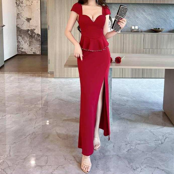 ブラック レッド ワンピース レディース ロングワンピース スリットドレス マーメイドライン パールベルト付き タイト エレガント セクシー フォーマル 上品 結婚式 二次会 パーティー お呼ばれ デート 高級感 大人きれい 美脚ライン ストレッチ 韓国ファッション 人気 春 夏 秋 冬 C-OSS0210
