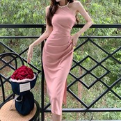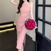 ブラック レッド ピンク ホワイト ワンピース レディース ミディ丈ワンピース ノースリーブ ドレス タイトドレス ハイネック パールネック エレガント 上品 セクシー 大人きれい 体型カバー 美シルエット 結婚式 二次会 パーティー デート 韓国ファッション 人気 トレンド 春 夏 秋 冬 C-OSS0211