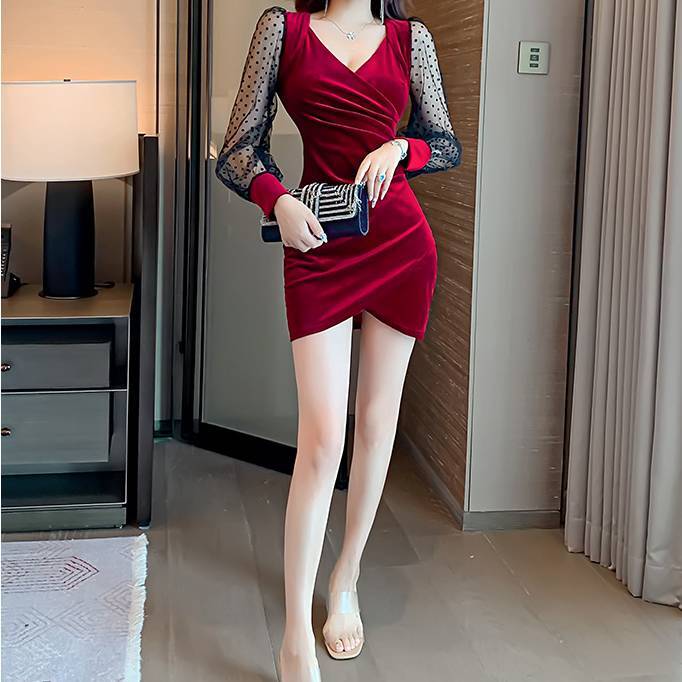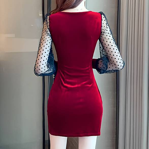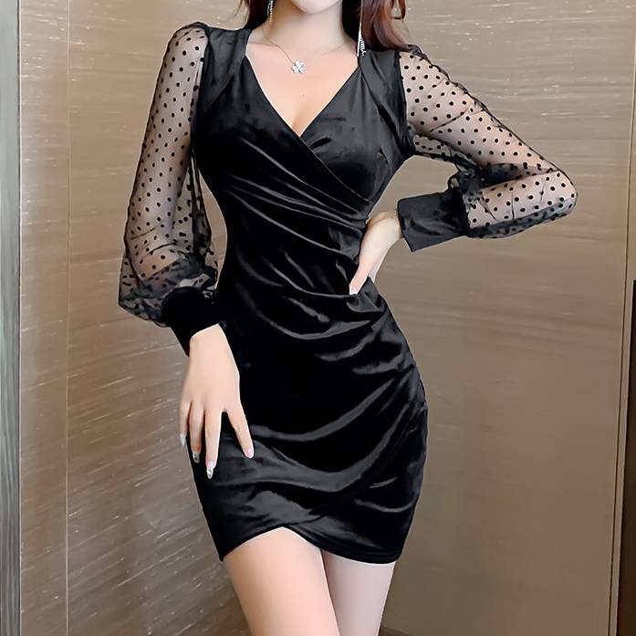ブラック レッド ワンピース レディース ベルベット ワンピース ミニ丈 タイトワンピース 長袖 ドットチュール シアースリーブ Vネック 上品 エレガント セクシー 高見え 韓国ファッション パーティー 二次会 デート 冬 春 秋 夏 トレンド 大人可愛い 人気 C-OSS0216