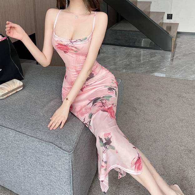 フラワープリント マーメイド ベアワンピース スリット入り キャミドレス タイトロングドレス 大人上品 デート ホテルディナー 写真映え ピンク C-OSS0228