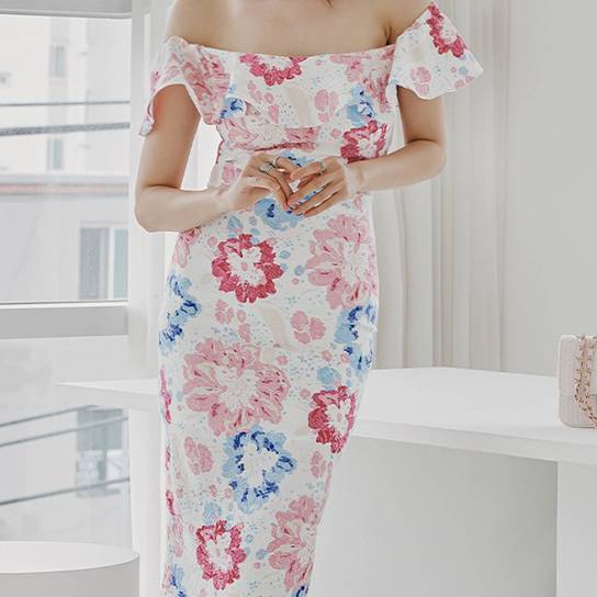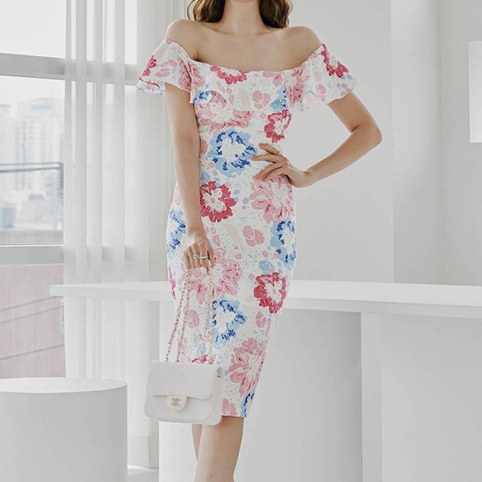 華やかなフラワープリントと女性らしいオフショルダーシルエットが魅力のタイトワンピース。