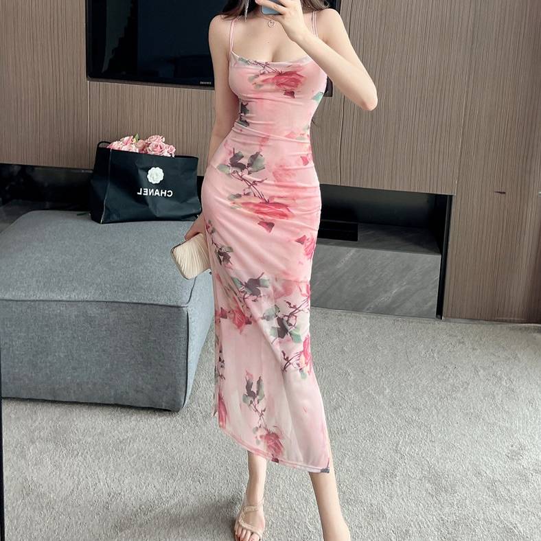フラワープリント マーメイド ベアワンピース スリット入り キャミドレス タイトロングドレス 大人上品 デート ホテルディナー 写真映え ピンク C-OSS0228