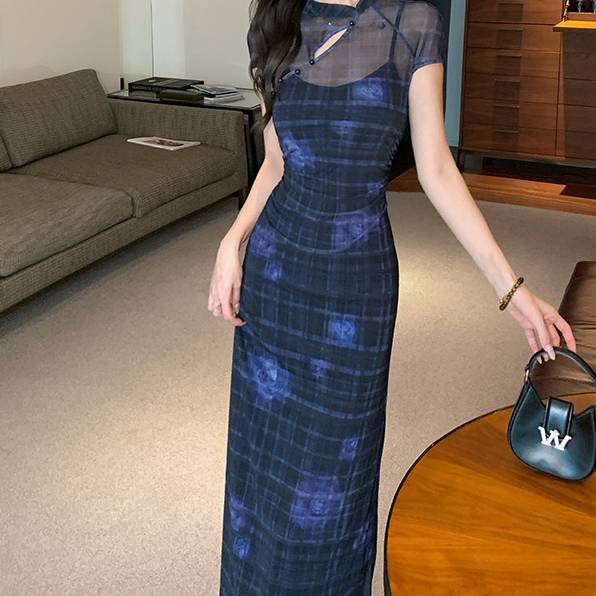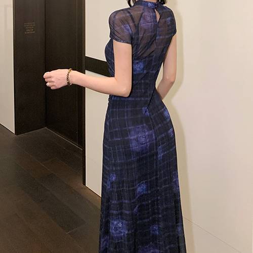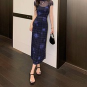 ロングワンピース レディース シアートップ レイヤード風 タイトワンピース 透け感 セクシー きれいめ 上品 スリム シルエット 美脚効果 体型カバー 韓国風 ロング丈 ブルー デート お出かけ ホテルディナー 大人女性 20代 30代 40代 おしゃれ 可愛い 着痩せ 春夏秋 冬 C-OSS0225