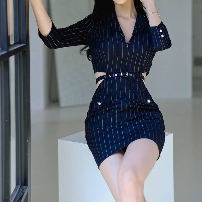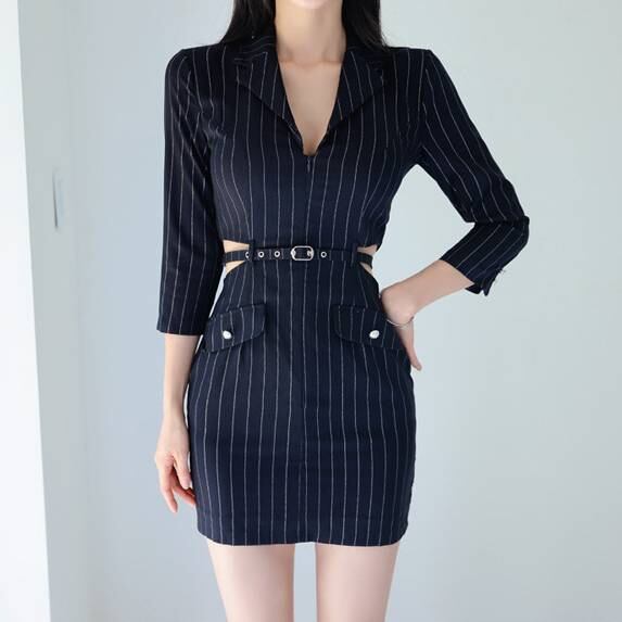 ネイビーブラック ワンピース レディース ミニワンピース タイトワンピース ストライプ 七分袖 ベルト付き 美シルエット スリム フォーマル エレガント セクシー 韓国ファッション 上品 大人可愛い デート パーティー 通勤 オフィス 春 夏 秋 冬 人気 トレンド C-OSS0215