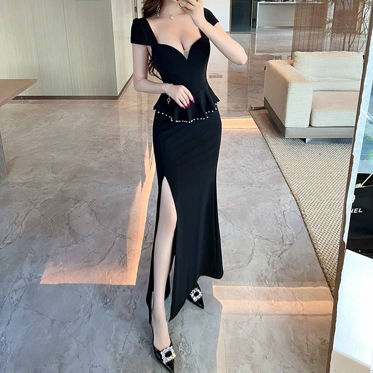 ブラック レッド ワンピース レディース ロングワンピース スリットドレス マーメイドライン パールベルト付き タイト エレガント セクシー フォーマル 上品 結婚式 二次会 パーティー お呼ばれ デート 高級感 大人きれい 美脚ライン ストレッチ 韓国ファッション 人気 春 夏 秋 冬 C-OSS0210