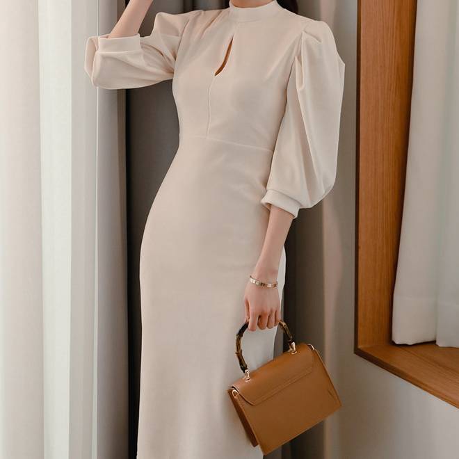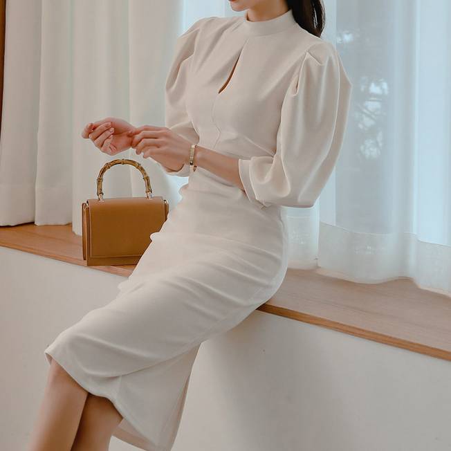 ホワイト ワンピース レディース ミディ丈 タイトワンピース パフスリーブ 長袖 ハイネック 上品 エレガント シンプル きれいめ 韓国ファッション 春 秋 冬 オフィス 通勤 デート お呼ばれ 二次会 パーティードレス 高級感 清楚 美シルエット 着痩せ 人気 トレンド C-OSS0201