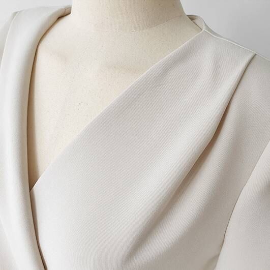 上品なカシュクールデザインがデコルテを美しく見せ、ボディラインにフィットするシルエットがエレガントな印象を演出します。