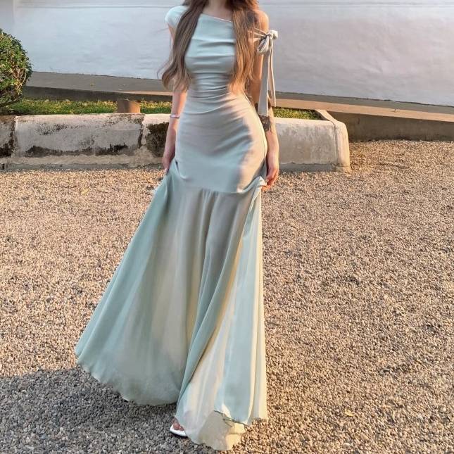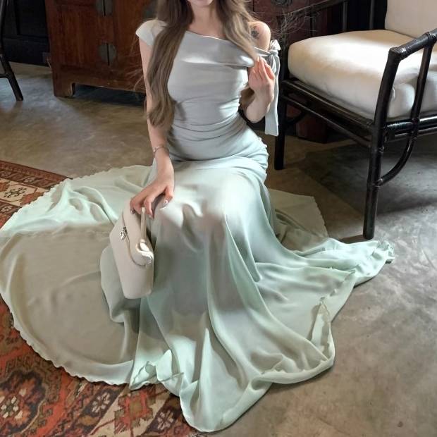 淡いライトグリーンの上品な光沢が魅力のワンショルダーロングドレス。