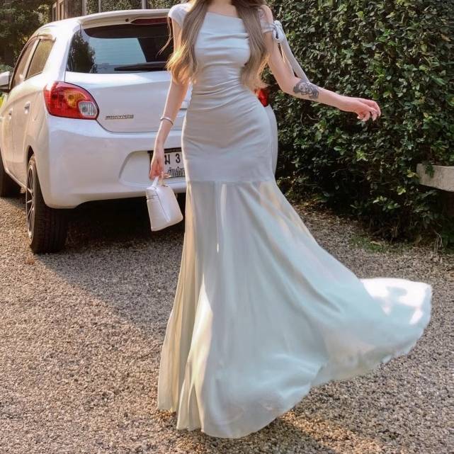 肩に結んだリボンが華やかで女性らしさを引き立て、マーメイドシルエットが美しい曲線を演出します。