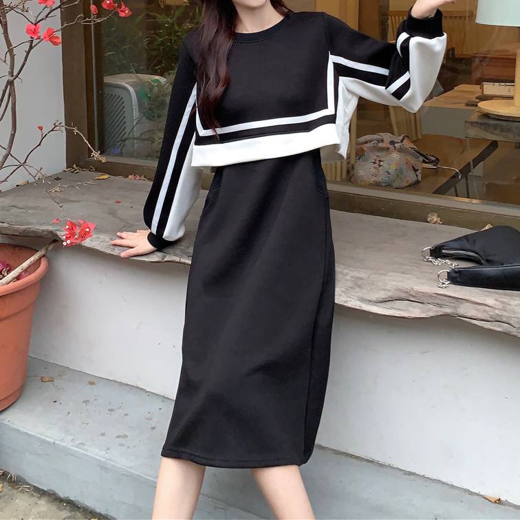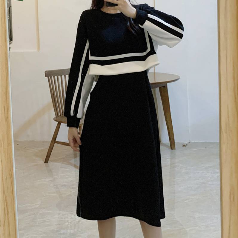 ニットワンピース レディース 長袖 ワンピース バイカラー ブラック 体型カバー Aライン ミディ丈 シンプル きれいめ 大人可愛い カジュアル 上品 秋冬 春 着痩せ効果 オフィスコーデ 通勤 通学 お出かけ デート 韓国風 ファッション ストリート モード 人気 トレンド おしゃれ 大人女子 コーデ C-COSS0185